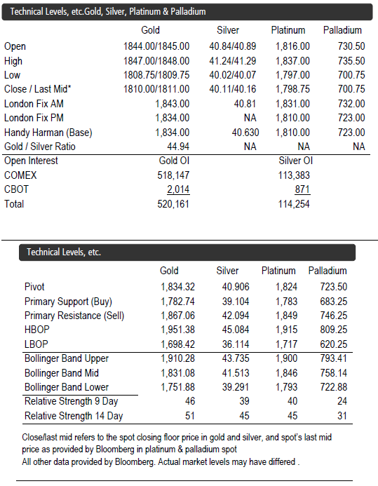 Vàng mở cửa phiên New York đầu tuần với hướng điều chỉnh khi khởi động từ mức 1844. Kim loại này sau đó đạt mức cao trong phiên là 1847 rồi nhanh chóng giảm sâu. Hoạt động chốt lời của các nhà đầu tư kéo vàng xuống tận 1808.75 sau khi chứng khoán hồi phục. Cuối ngày, kim loại này dừng lại ở 1810.
