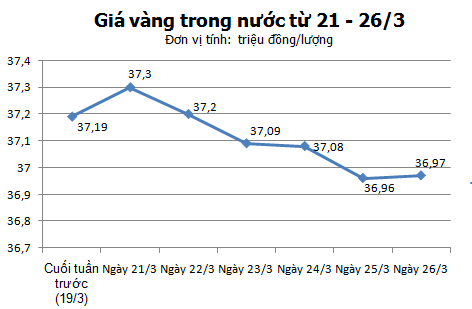 Trong tuần, giá vàng lên cao nhất ở 37,3 triệu đồng/lượng. Sau đó liên tục giảm khoảng 100.000 đồng/lượng/ngày.