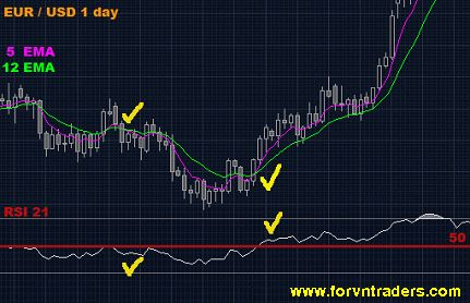 Nguyên tắc mở giao dịch : BUY khi đường 5 EMA quay lên và cắt qua đường 12 EMA, RSI trên 50. SEL khi đường 5 EMA quay xuống và cắt qua đường 12 EMA, RSI dưới 50.